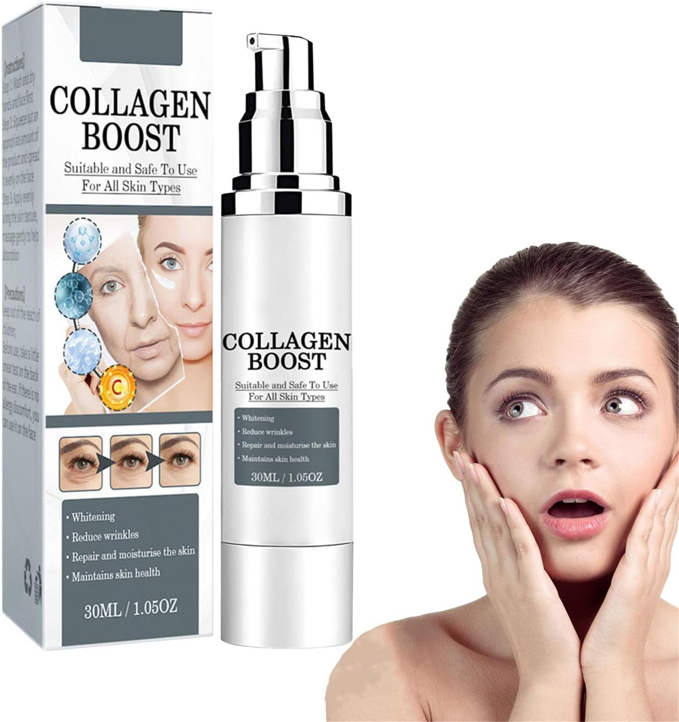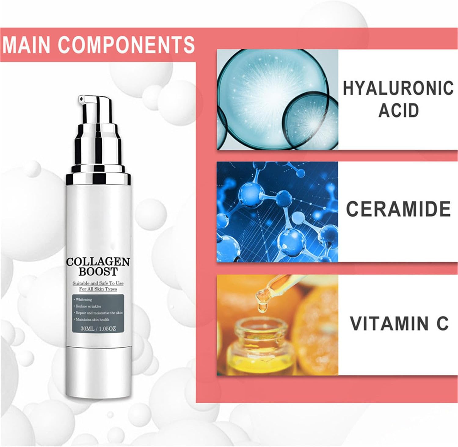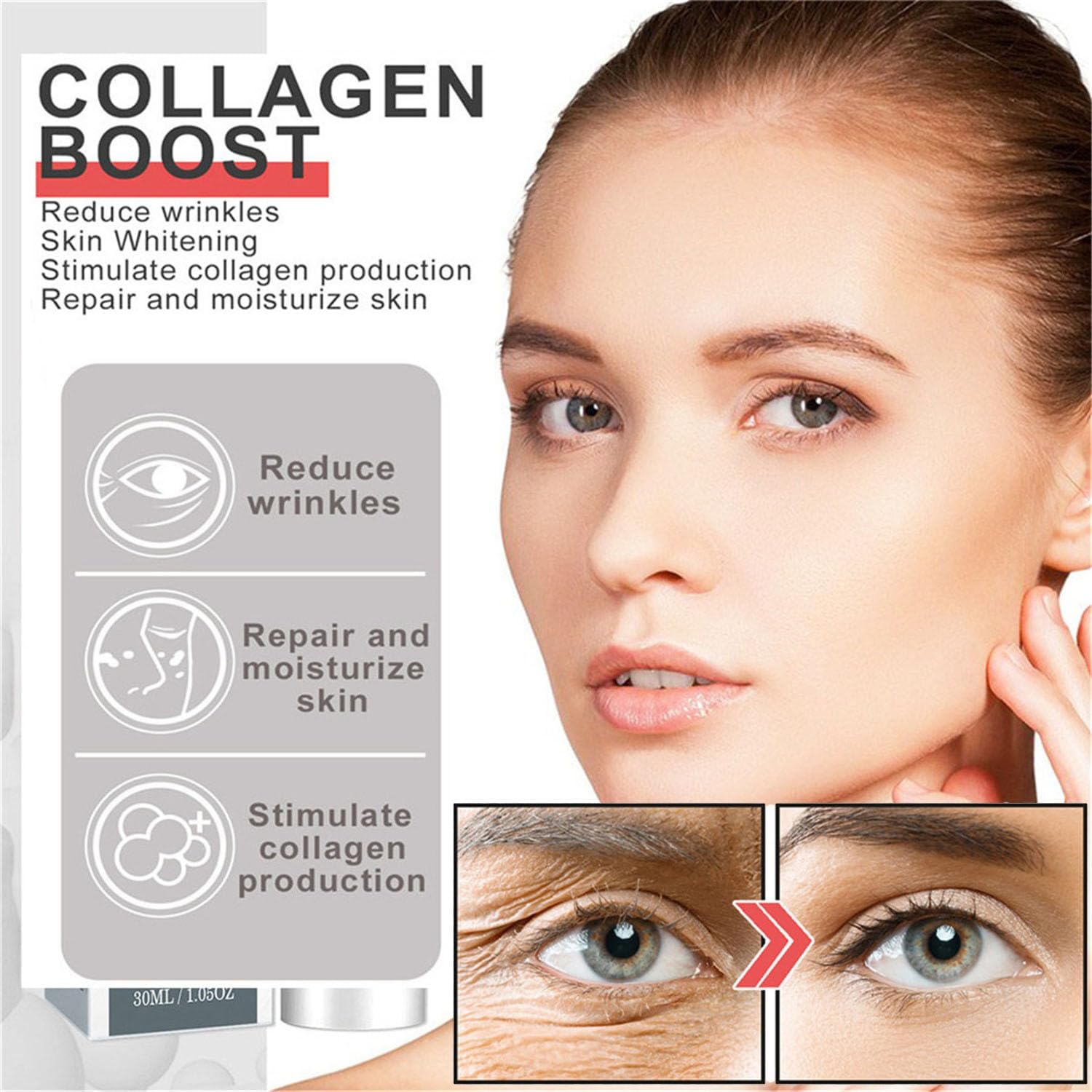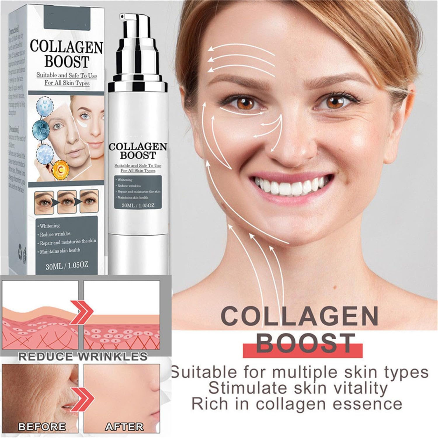 - Seguro y eficaz: El colágeno mejora la esencia antienvejecimiento y se puede usar día y noche. Elimina más del 90% de arrugas y líneas finas, más del 93,2% de tensión facial e hidratación y aclarar hasta en un 95,6% de piel oscurecida.