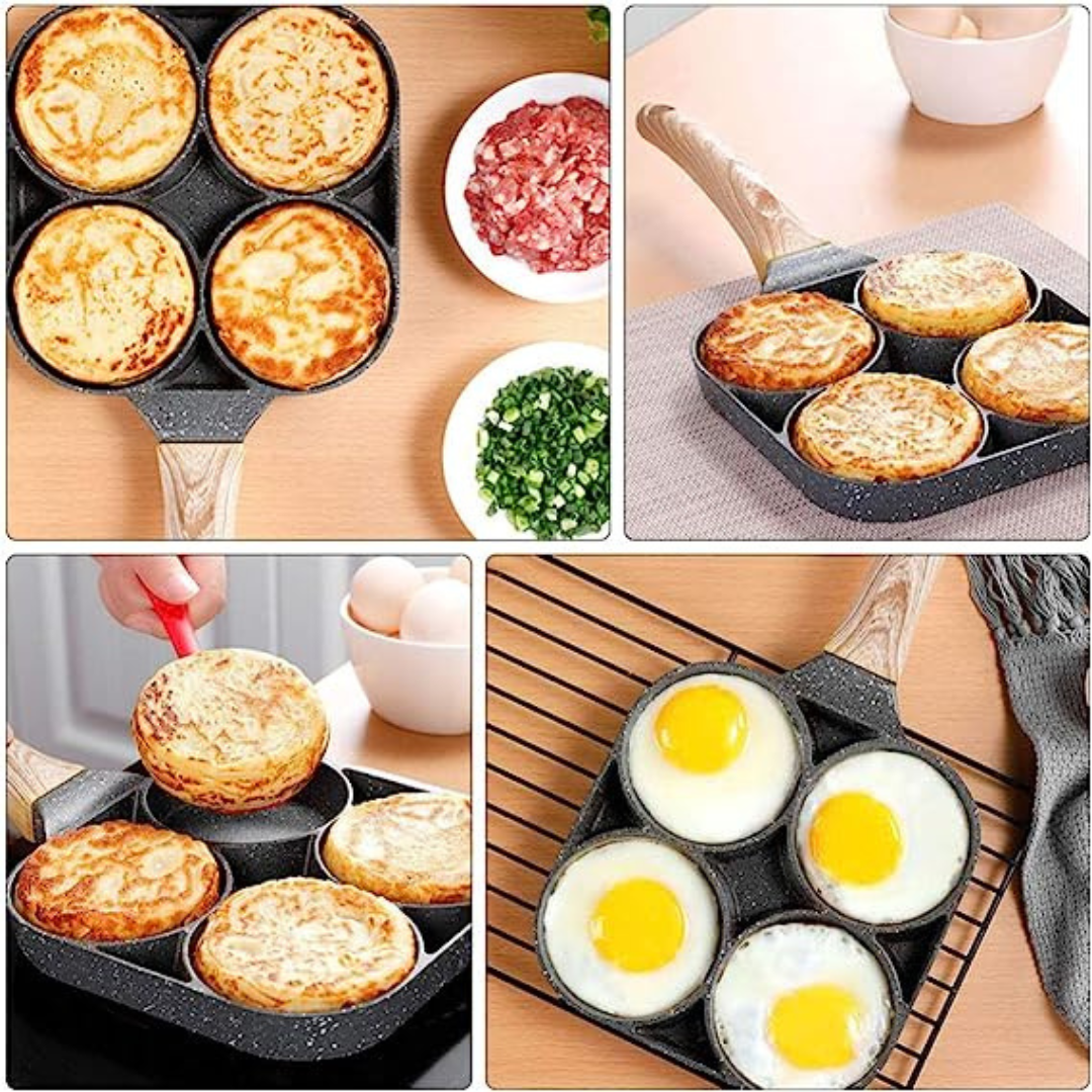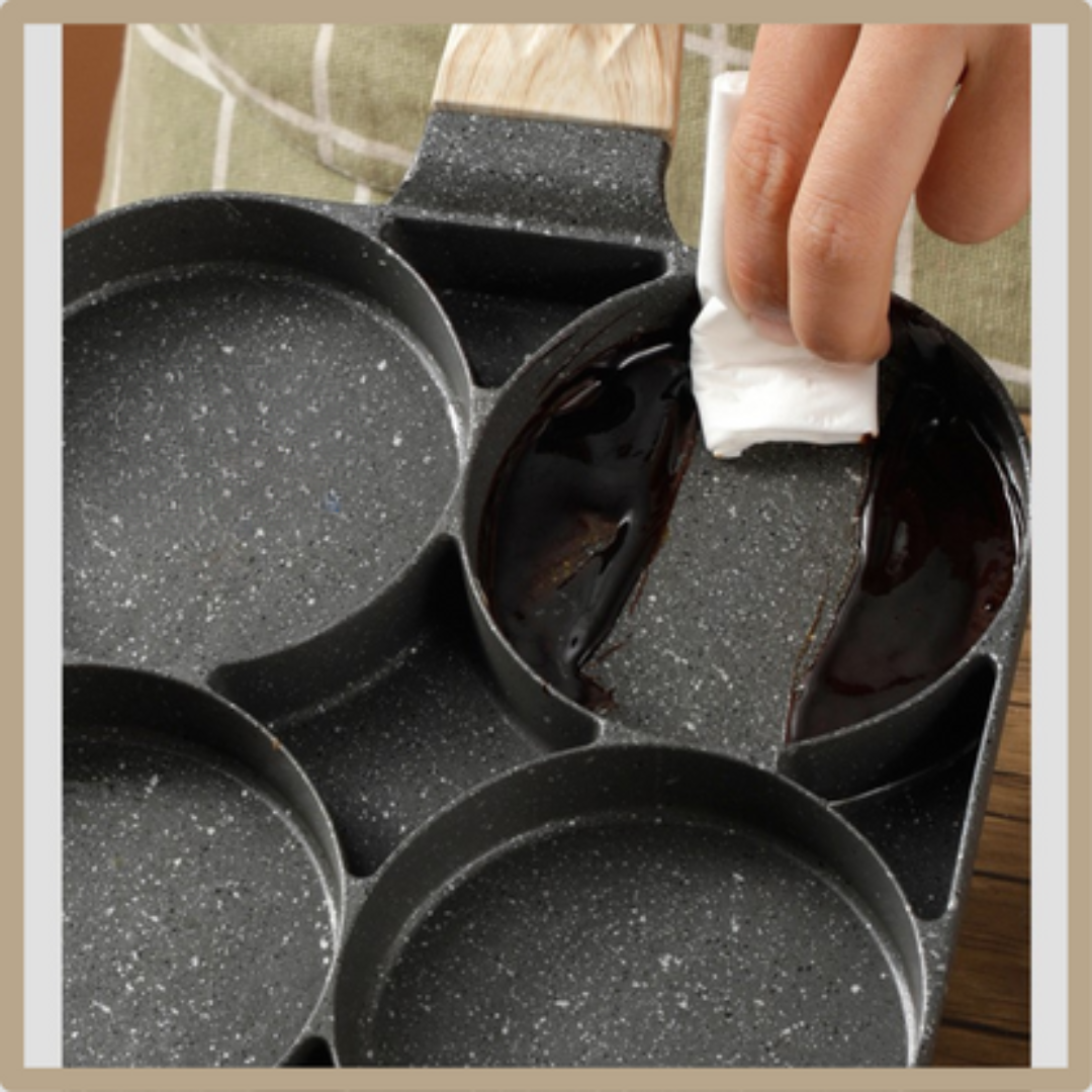 La limpieza después de cocinar es pan comido con la Sartén Antiadherente de 4 Puestos. La superficie antiadherente de alta calidad permite que los alimentos se deslicen fácilmente, dejando solo residuos mínimos. Basta con un simple enjuague y un toque de detergente, y tu sartén estará lista para el próximo uso. ¡Adiós a fregar sartenes y horas de limpieza!